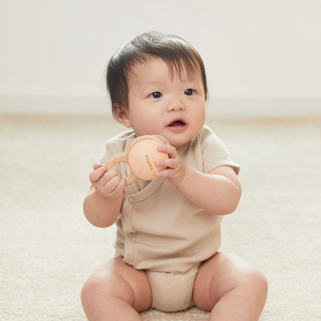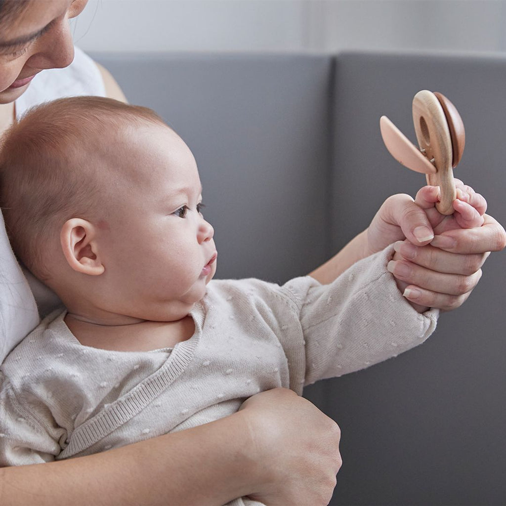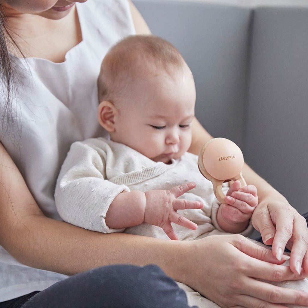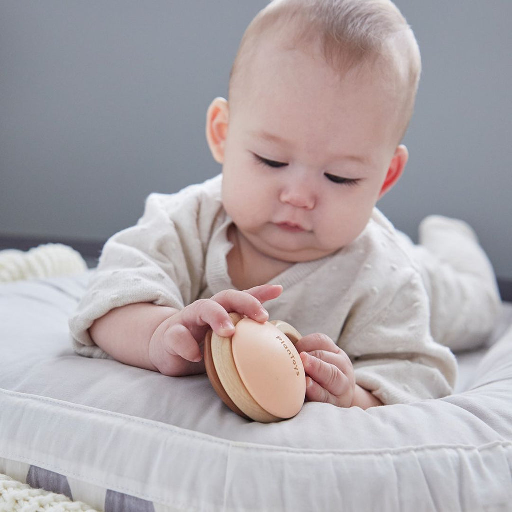 The PlanToys Shake N Clap Rattle will keep your little one engaged and learning as they shake the rattle to play music. The design is simple but it is packed with developmental play. The rattle will engage their vision, hearing and tactile sense through play. Great for parent guided play in early months to help develop eye tracking as they will follow the rustic colors and sounds as it is gently shaken. The smooth surfaces, contours and grasping ring are a delight for baby to hold. Connect it to your carrier, stroller or shirt with your favorite clip for on the go play. Made with organic pigments and water based dyes for your peace of mind.