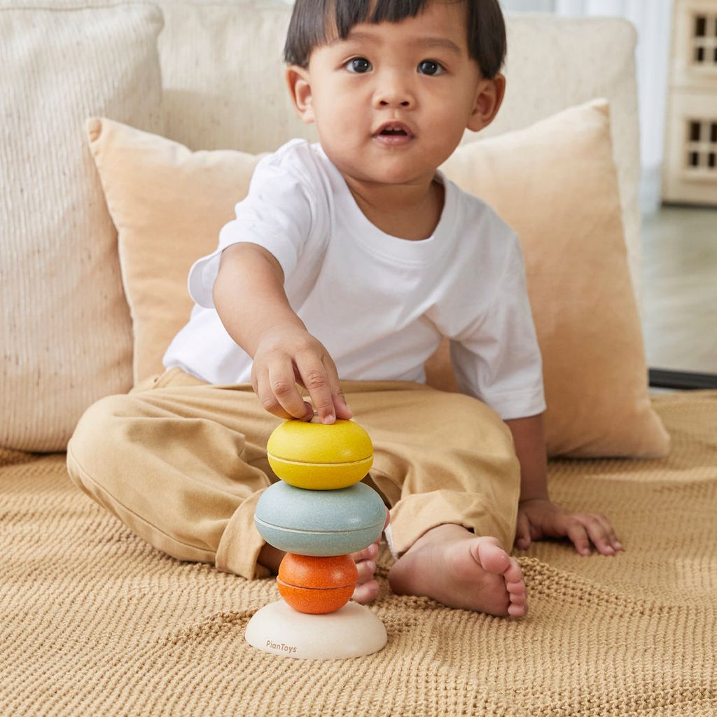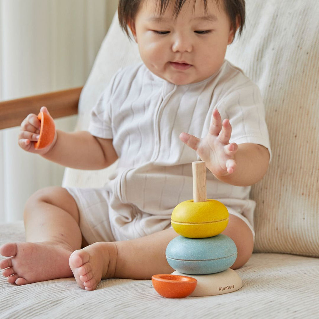 The pieces of the PlanToys Stacking Ring - Cups can be arranged and stacked in various ways. Use the ring cups to stack on the base and rod or play with them on the floor to create different shapes and explore nesting.