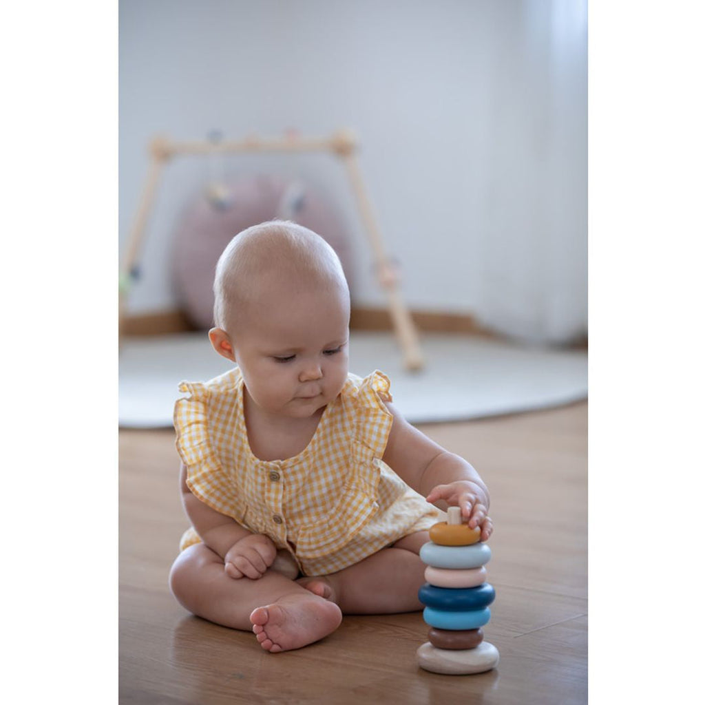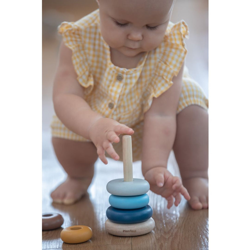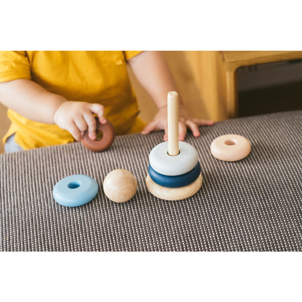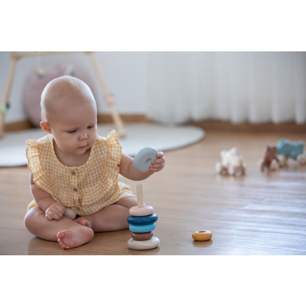 The colorful wooden rings of the PlanTosy Stacking Ring set help teach children about size and colors. For safety precautions, the center rod is foldable. This version of the Stacking Ring comes in our Orchard colorway.