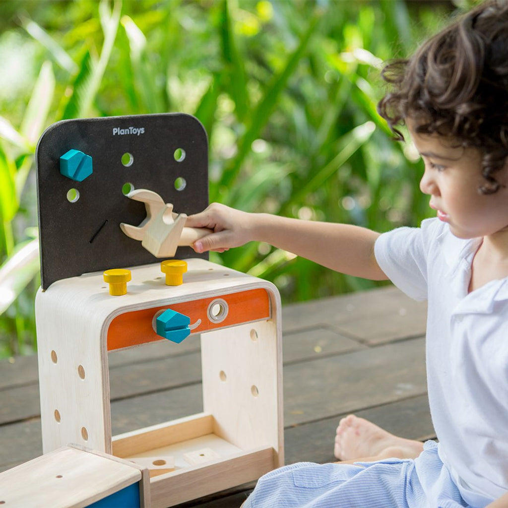 - The PlanToys Workbench comes with 22 tools and pieces: 1 workbench, 1 hammer, 1 wrench, 2 nuts, 4 screws, 2 nails, 2 cubes, 2 wheels, 2 half spheres, 6 wood plates